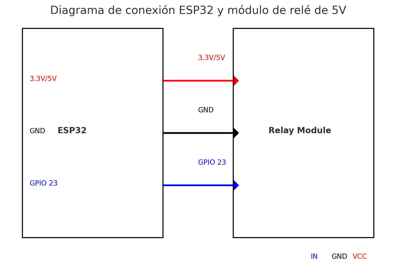 - VCC del módulo de relé conectado al pin 3.3V o 5V del ESP32.